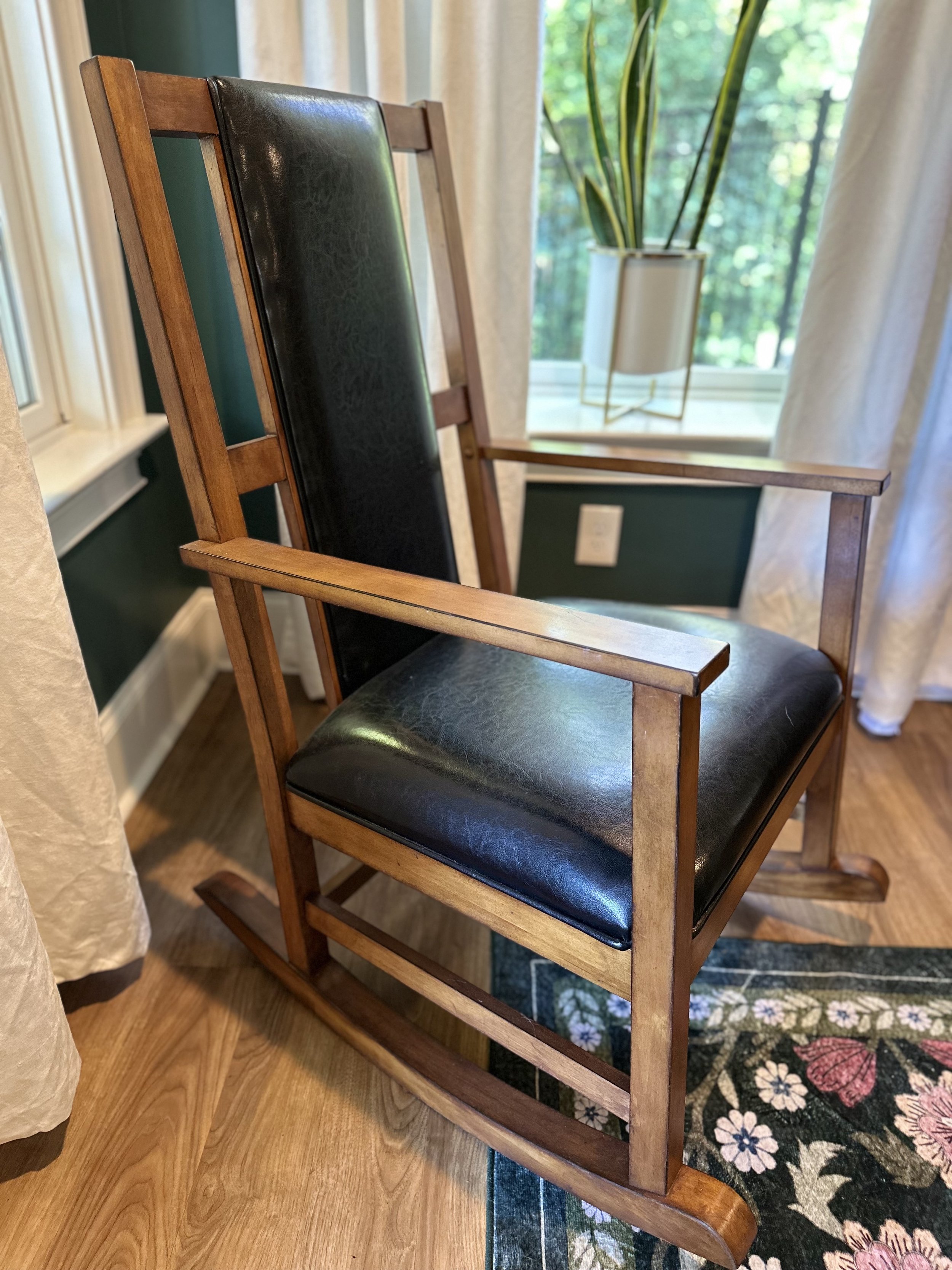 A classic rocking chair with quiet sophistication. The rich dark oak frame features subtle blackened edges that complement the smooth black leather seat and backrest. Beautifully balanced and in exceptional condition, this piece offers both comfort and character. This will be a timeless accent that feels right at home in any cozy corner or reading nook.