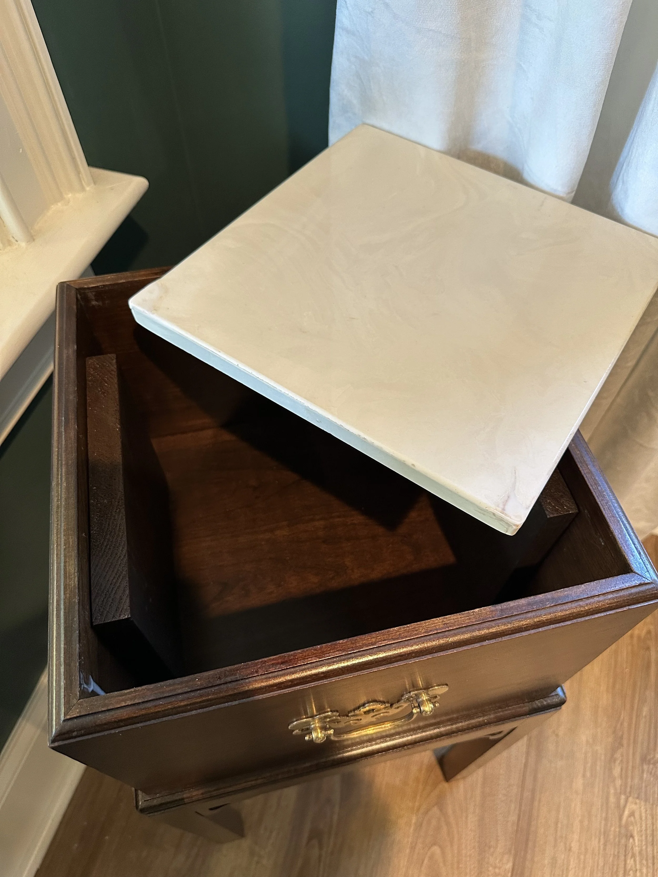A dark, richly finished plant stand with vintage charm and clever design. The solid wood base features aged hardware and a removable marble slab top, revealing a hollow interior perfect for hidden storage or an unexpected touch of character. The natural stone surface adds quiet elegance, making this piece as functional as it is timeless.