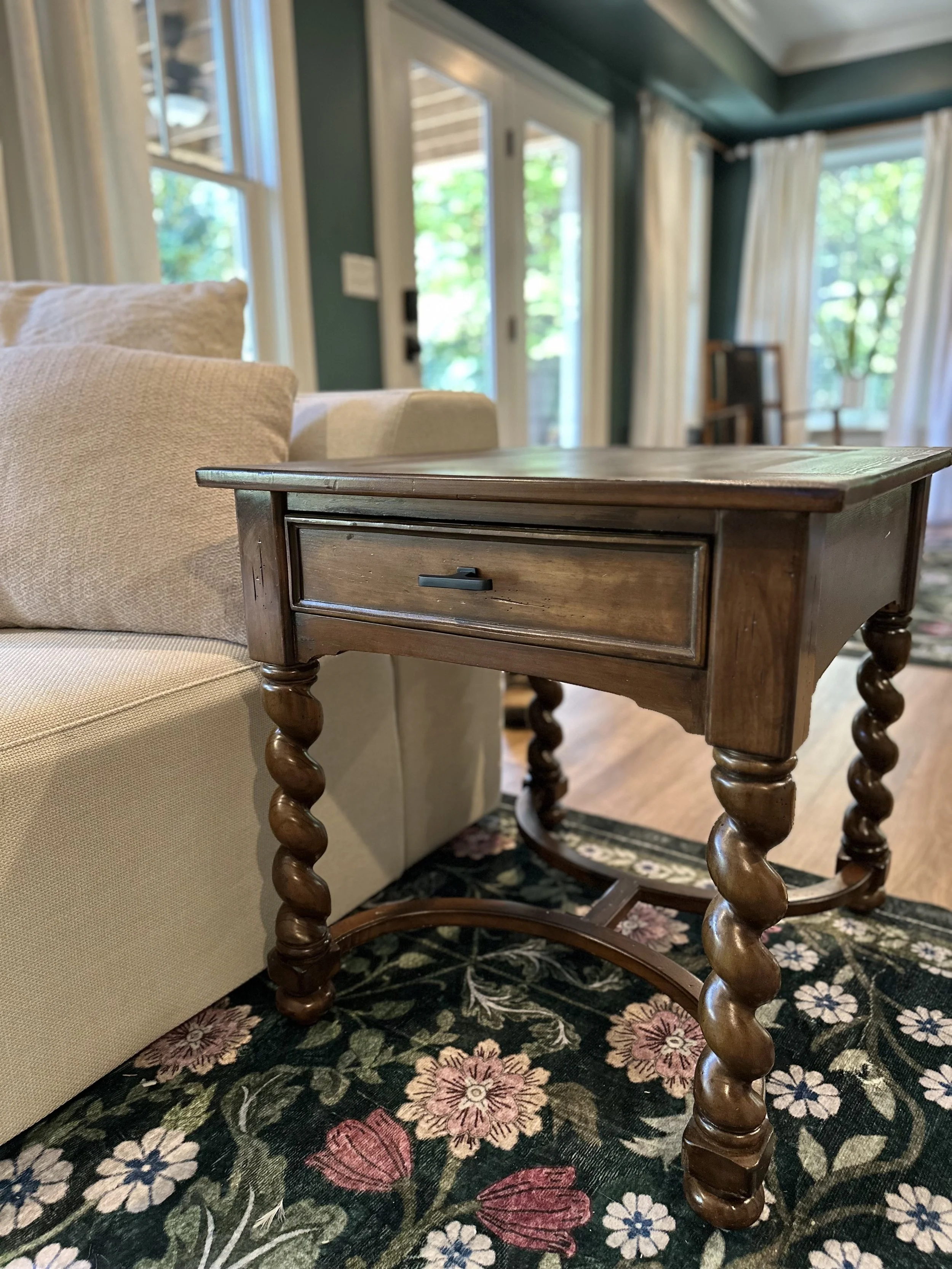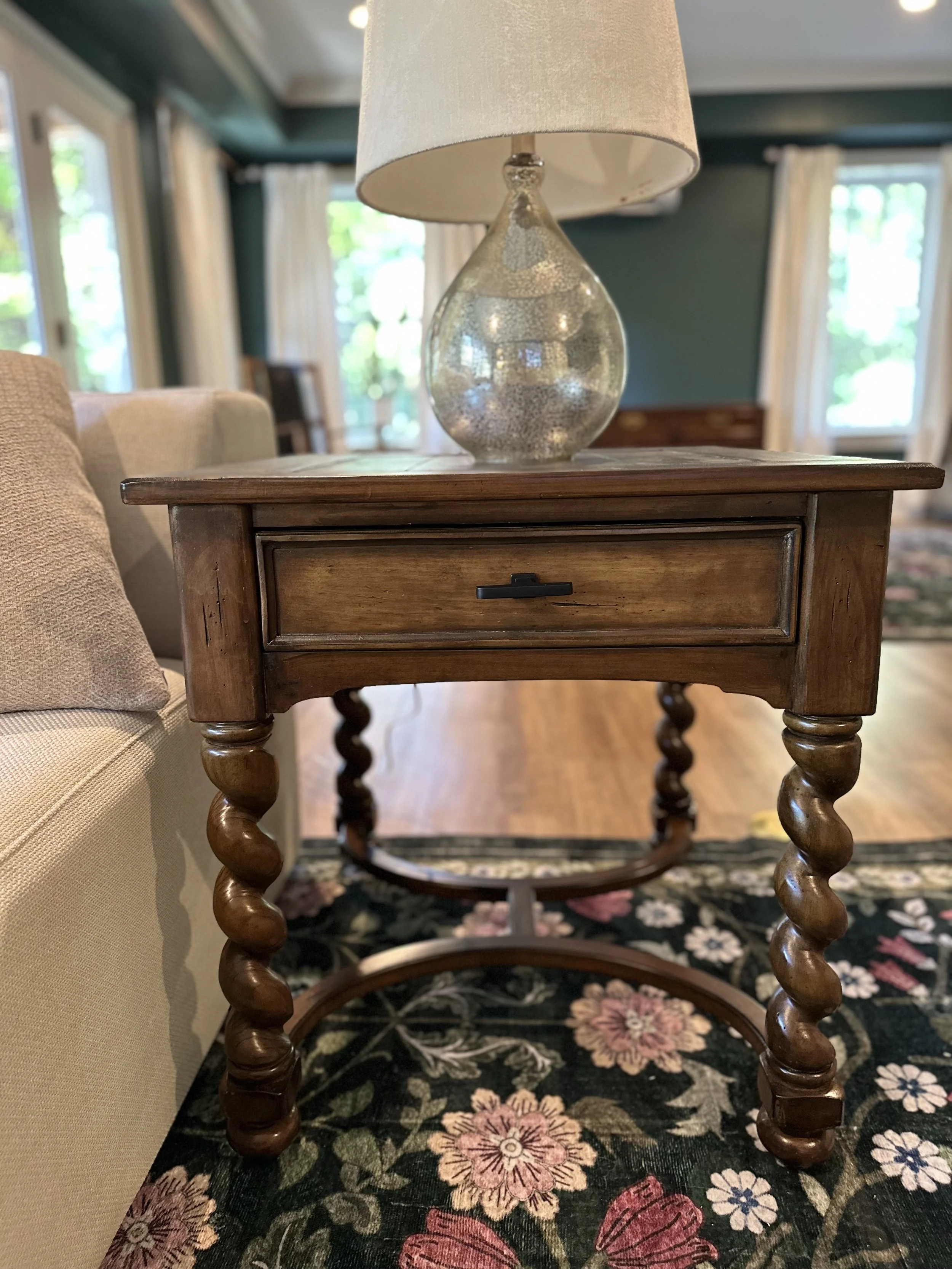 A richly stained side table that blends rustic charm with classic craftsmanship. Its twisted, turned legs give the piece striking character, while the subtly distressed finish and dark brown tones create a warm, timeworn feel. A single drawer with a sleek black knob adds a touch of modern contrast. Perfect beside a chair or sofa, this table brings texture and soul to any space.