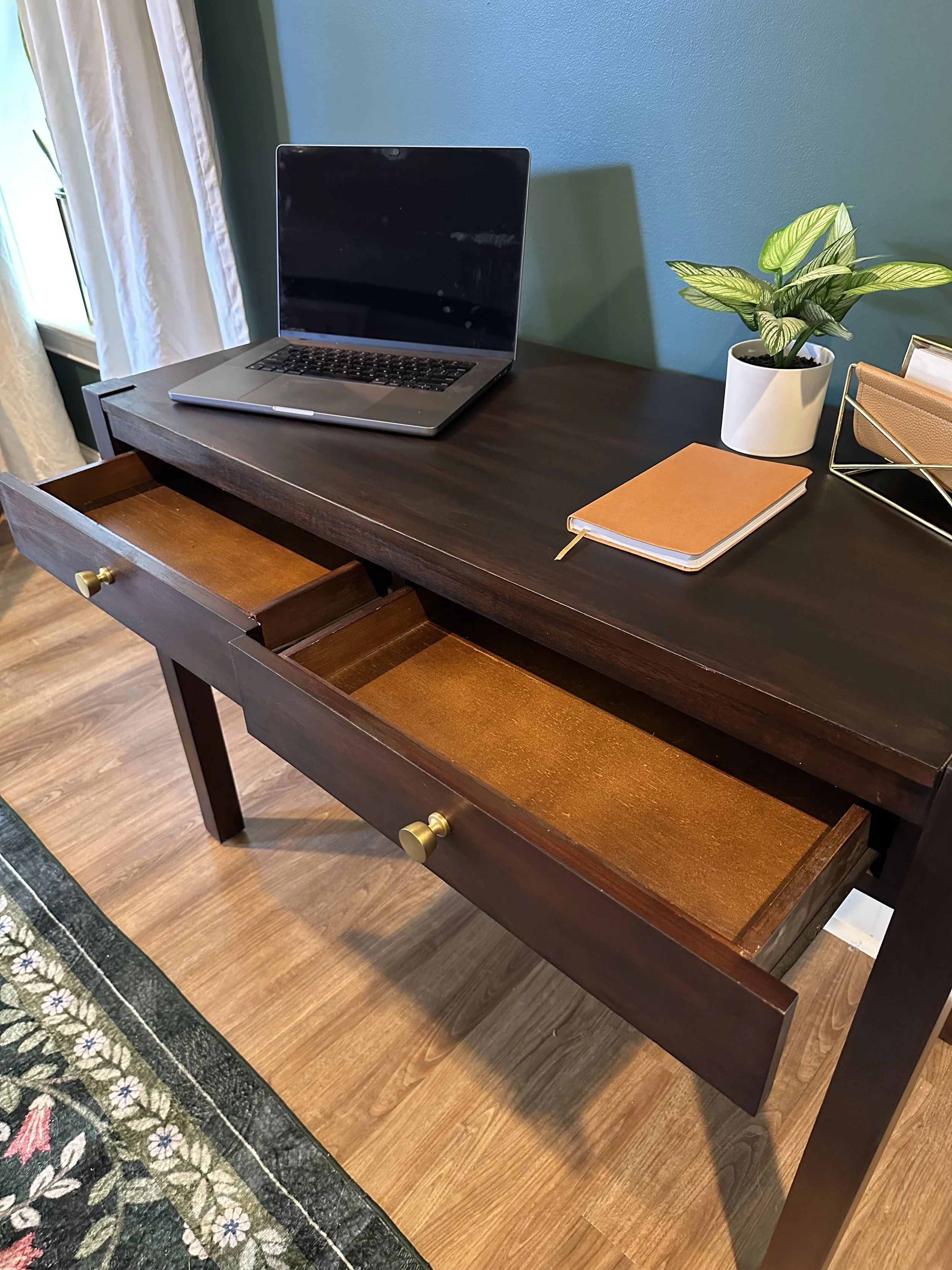 A handsome desk finished in a rich blend of red mahogany and dark walnut tones. Two drawers with new gold knobs add a refined touch of contrast, bringing warmth and elegance to its clean lines. While not solid wood throughout, this piece features dovetail drawers and has been carefully restored to ensure stability, beauty, and everyday function; proof that thoughtful craftsmanship can give any desk lasting purpose.