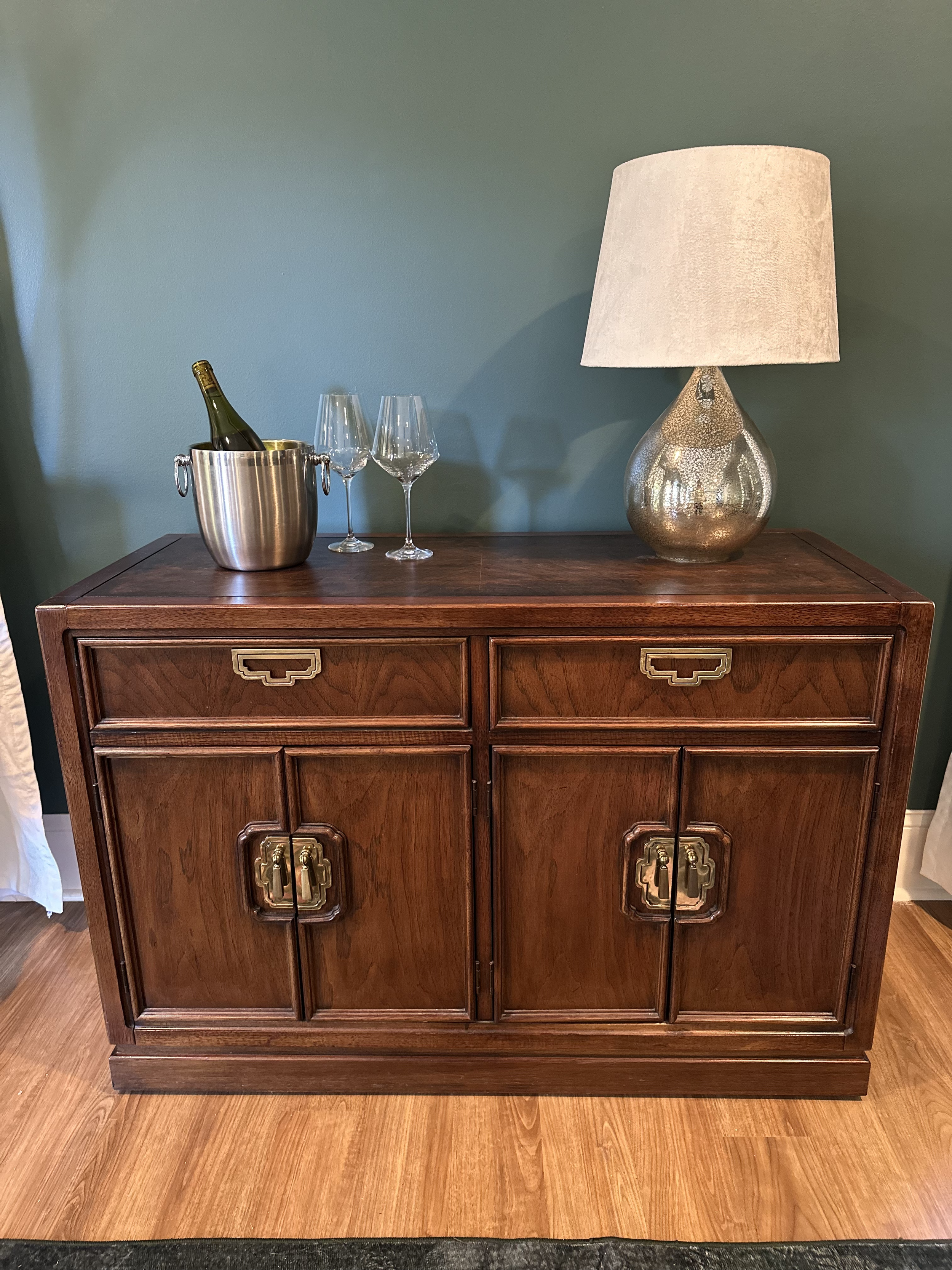 A striking Thomasville cabinet with a rich, dark finish and unmistakable craftsmanship. Two drawers and dual cabinet doors offer generous storage, while the grain of the wood glows with a tiger-stripe pattern that catches the light beautifully. Heavy, solid, and built to last, this piece brings both warmth and presence to any space; perfect styled as a bar or statement accent.